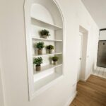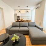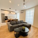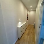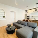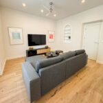El salón está elegantemente amueblado con sofá chaise longue gris oscuro, mesas de centro de mármol negro, cortinas ignífugas, estanterías lacadas en blanco y una espectacular TV de 63”, creando un ambiente moderno y confortable.