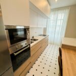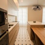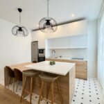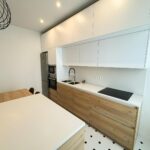 La cocina, completamente equipada, dispone de placa de inducción de 3 fuegos, frigorífico combi, horno, microondas y mobiliario en tonos blancos y madera, aportando un diseño actual y práctico.