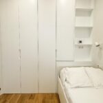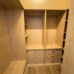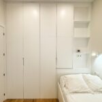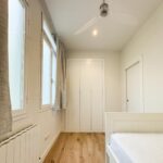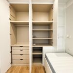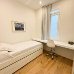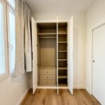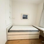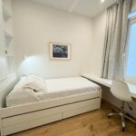 Tercer dormitorio con cama de madera blanca con cama auxiliar nido, armario empotrado y escritorio a medida, ideal como habitación juvenil o despacho.