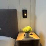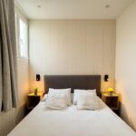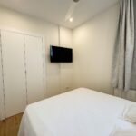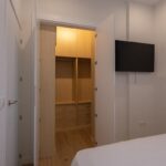 Dormitorio principal con cama canapé de 150×190, cortina ignífuga blackout, Smart TV de 43”, vestidor de madera con puertas lacadas en blanco, dos mesitas de noche y ventilador de techo con palas transparentes.