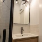 Un segundo baño con cabina de ducha, mueble de lavabo, grifería negra, espejo y focos.