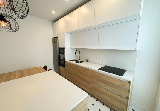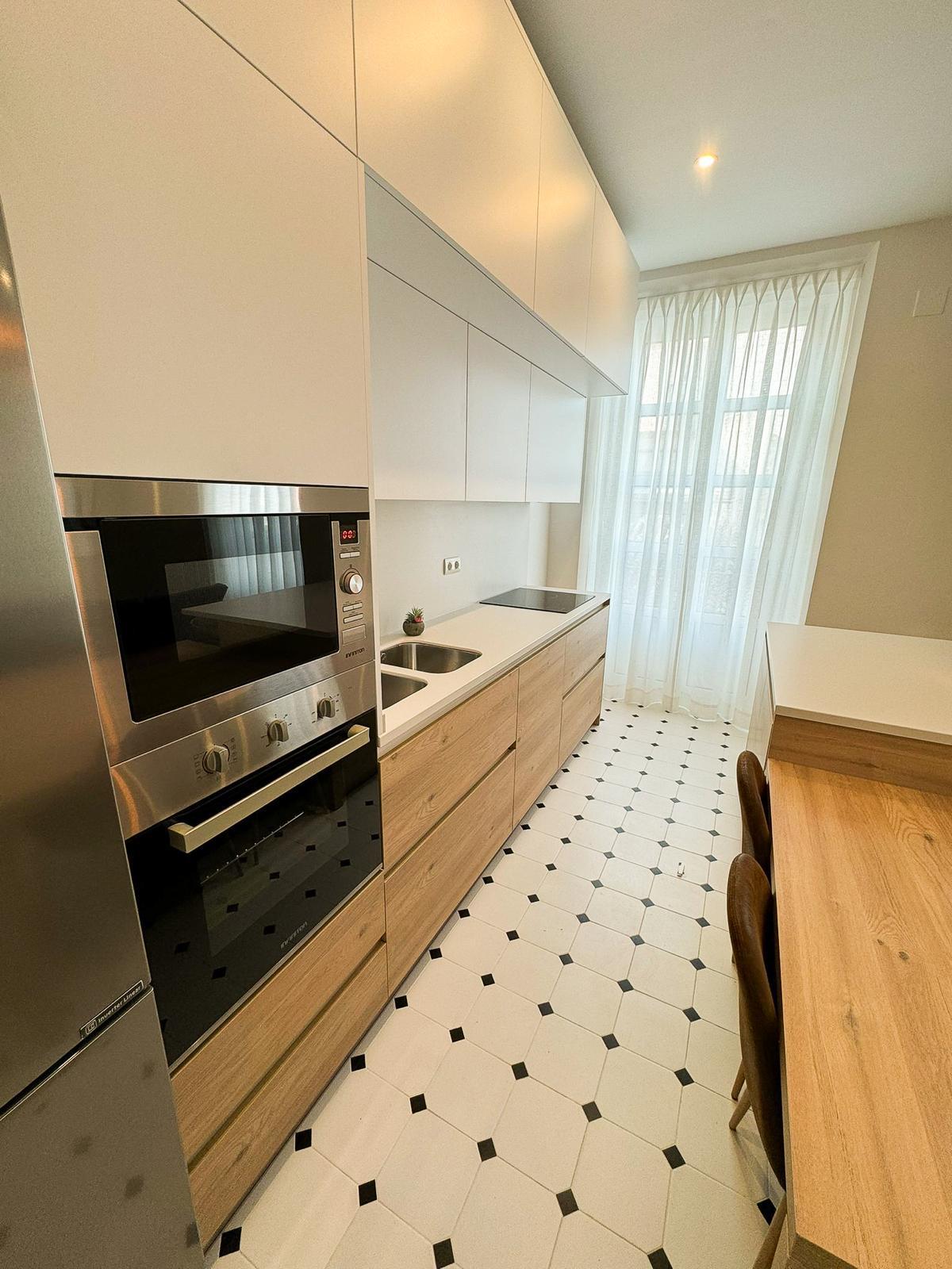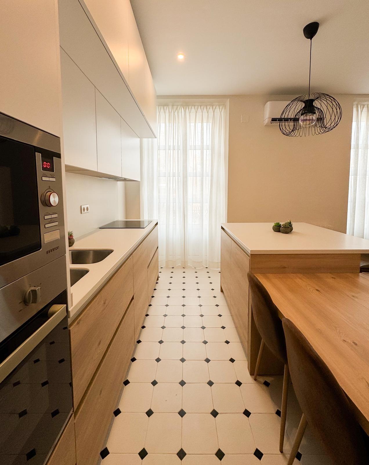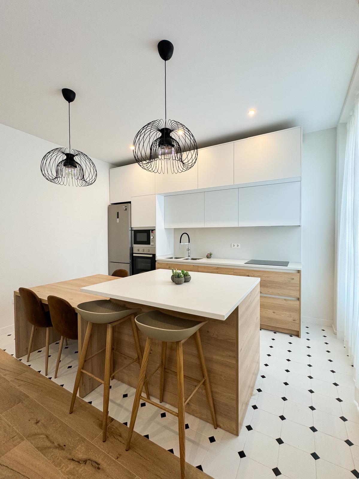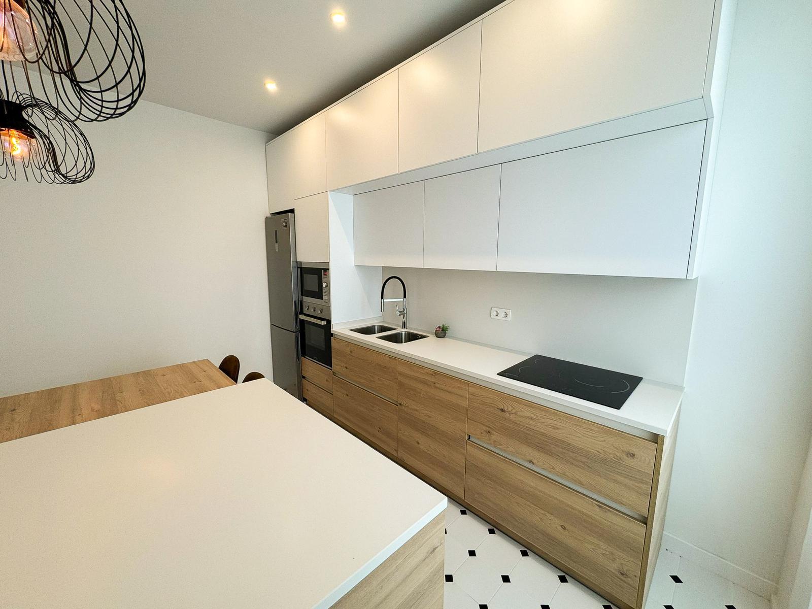 La cocina, completamente equipada, dispone de placa de inducción de 3 fuegos, frigorífico combi, horno, microondas y mobiliario en tonos blancos y madera, aportando un diseño actual y práctico.