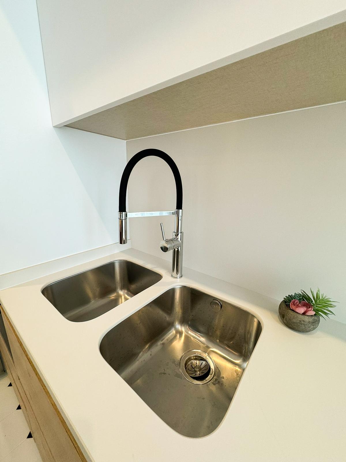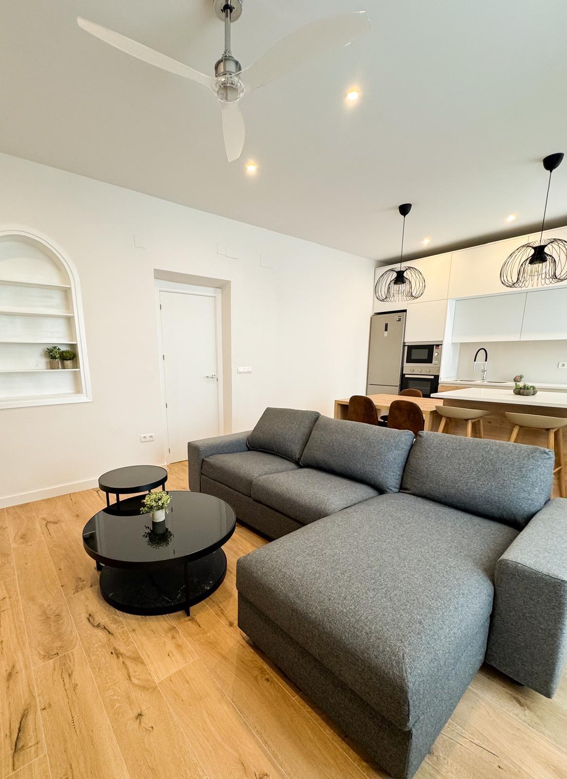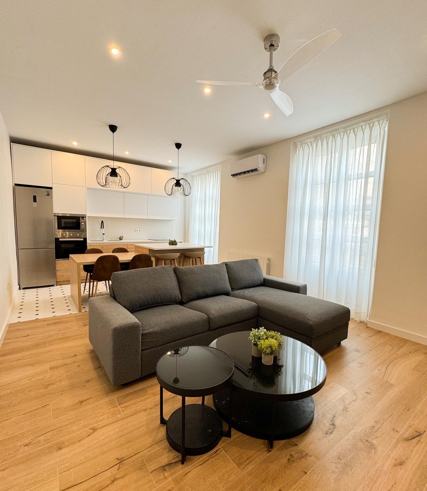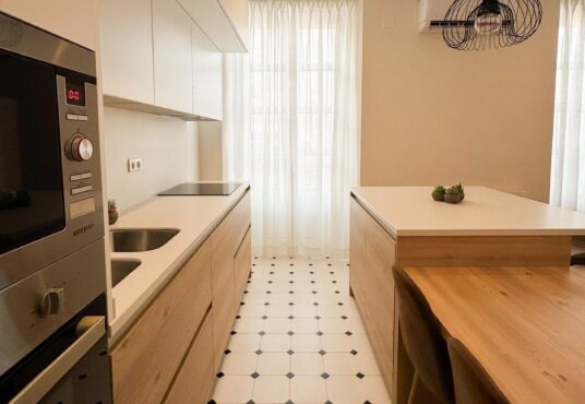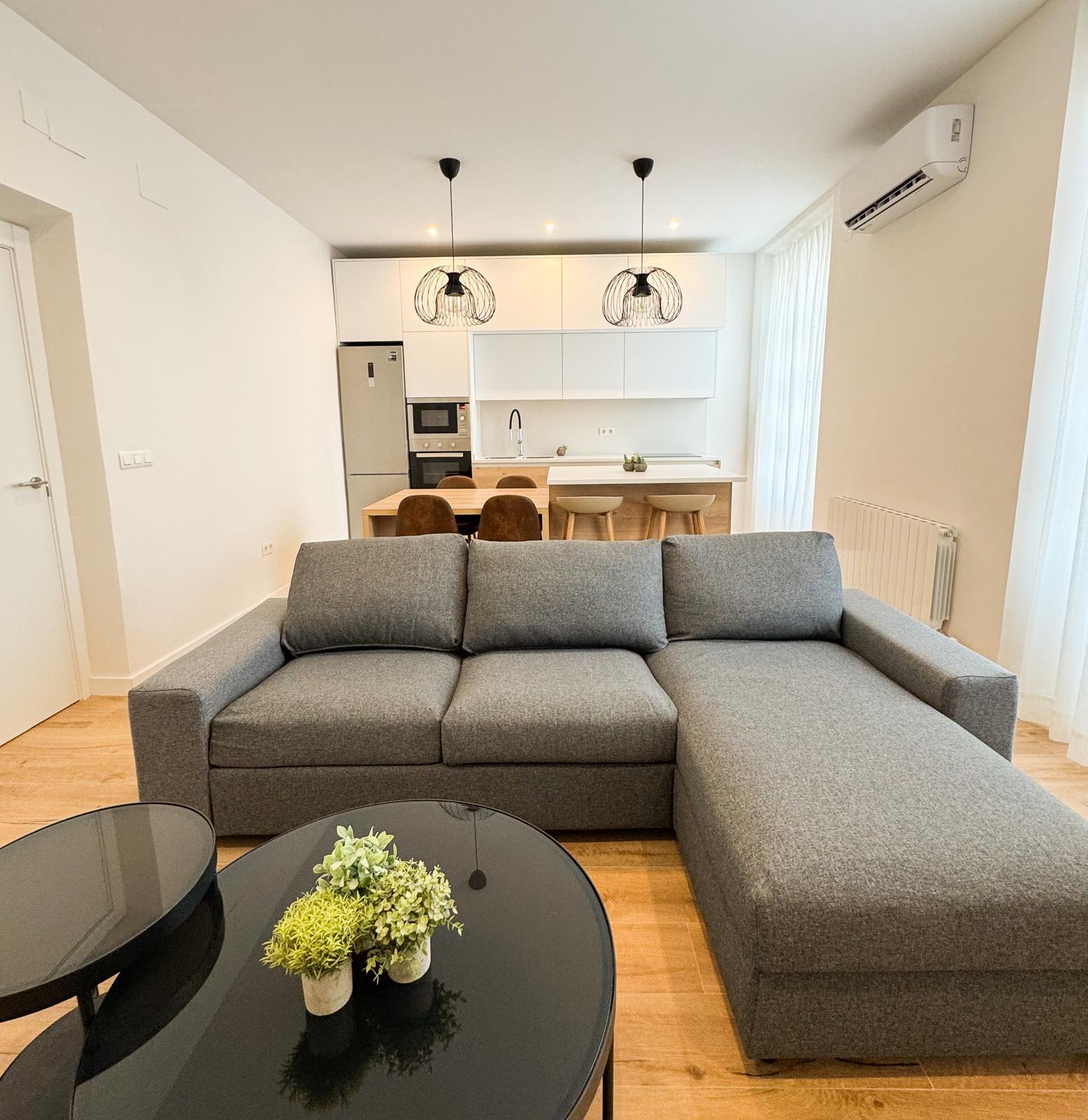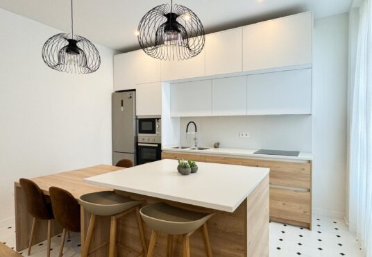 La cocina, completamente equipada, dispone de placa de inducción de 3 fuegos, frigorífico combi, horno, microondas y mobiliario en tonos blancos y madera, aportando un diseño actual y práctico.