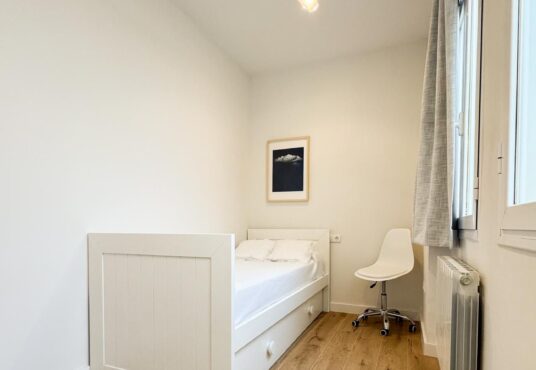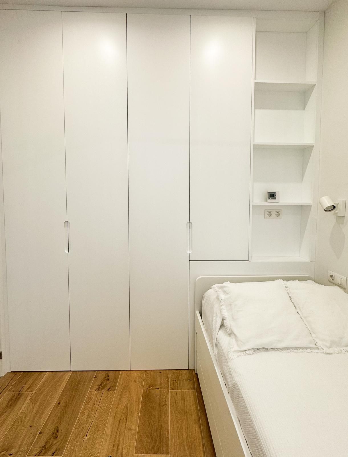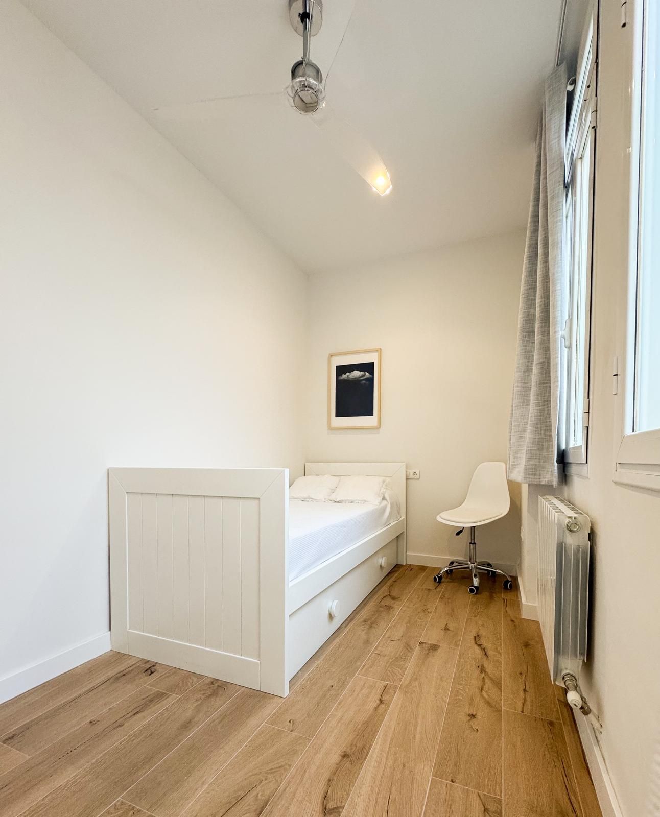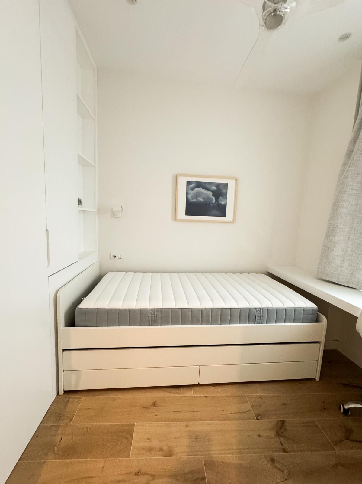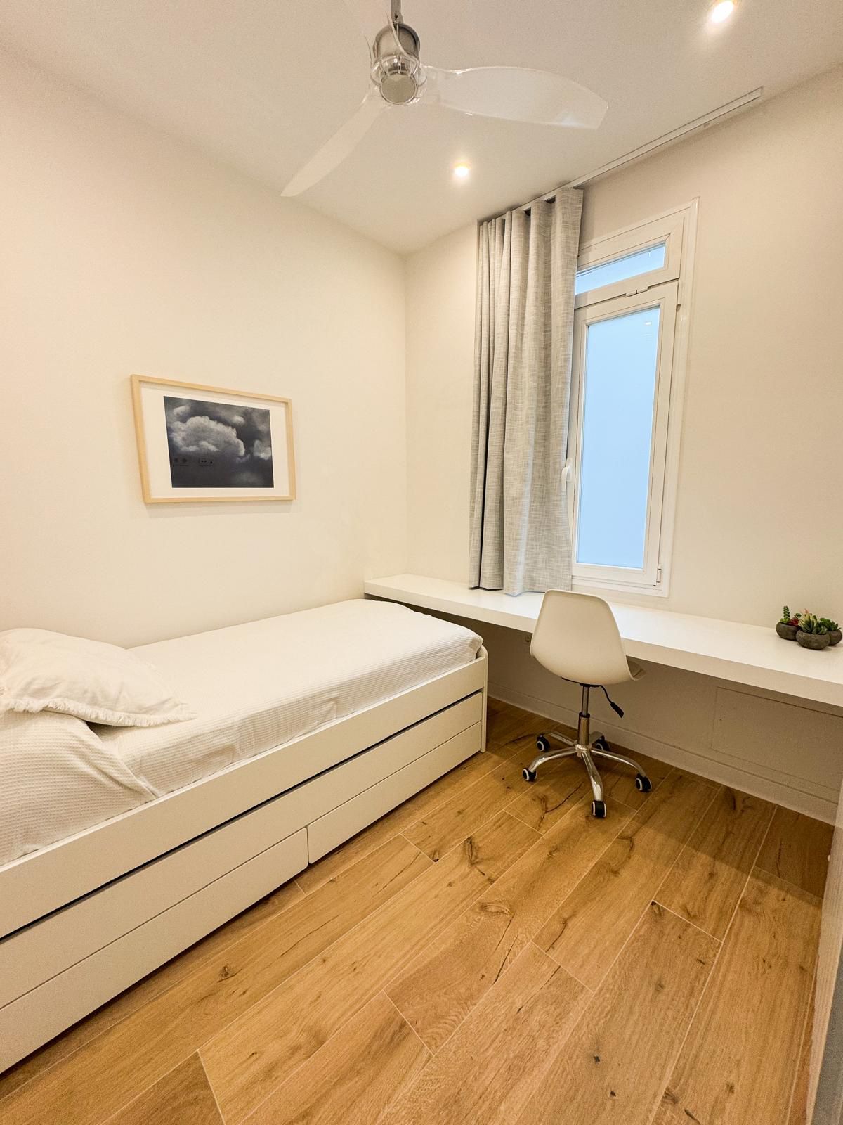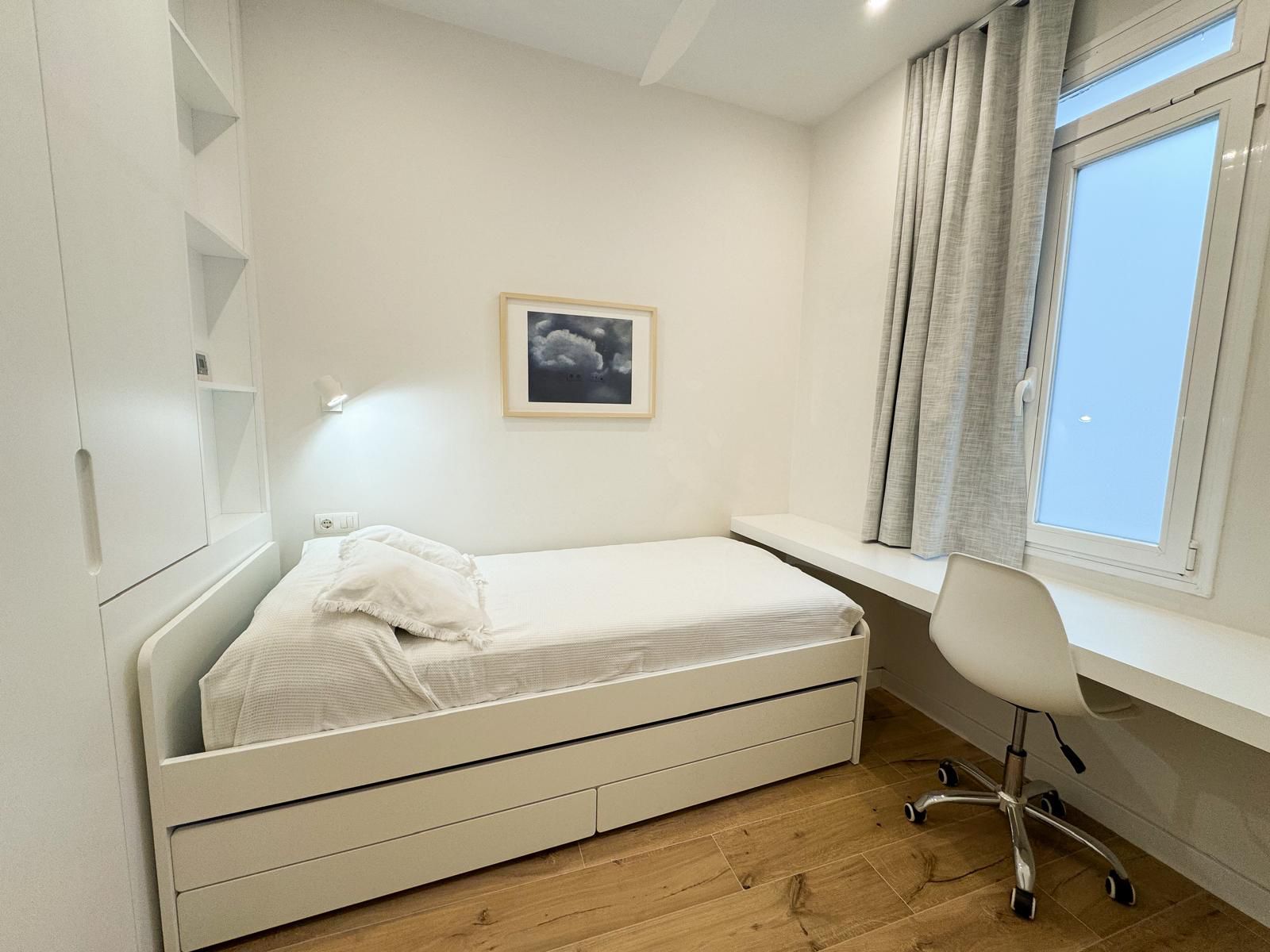 Tercer dormitorio con cama de madera blanca con cama auxiliar nido, armario empotrado y escritorio a medida, ideal como habitación juvenil o despacho.