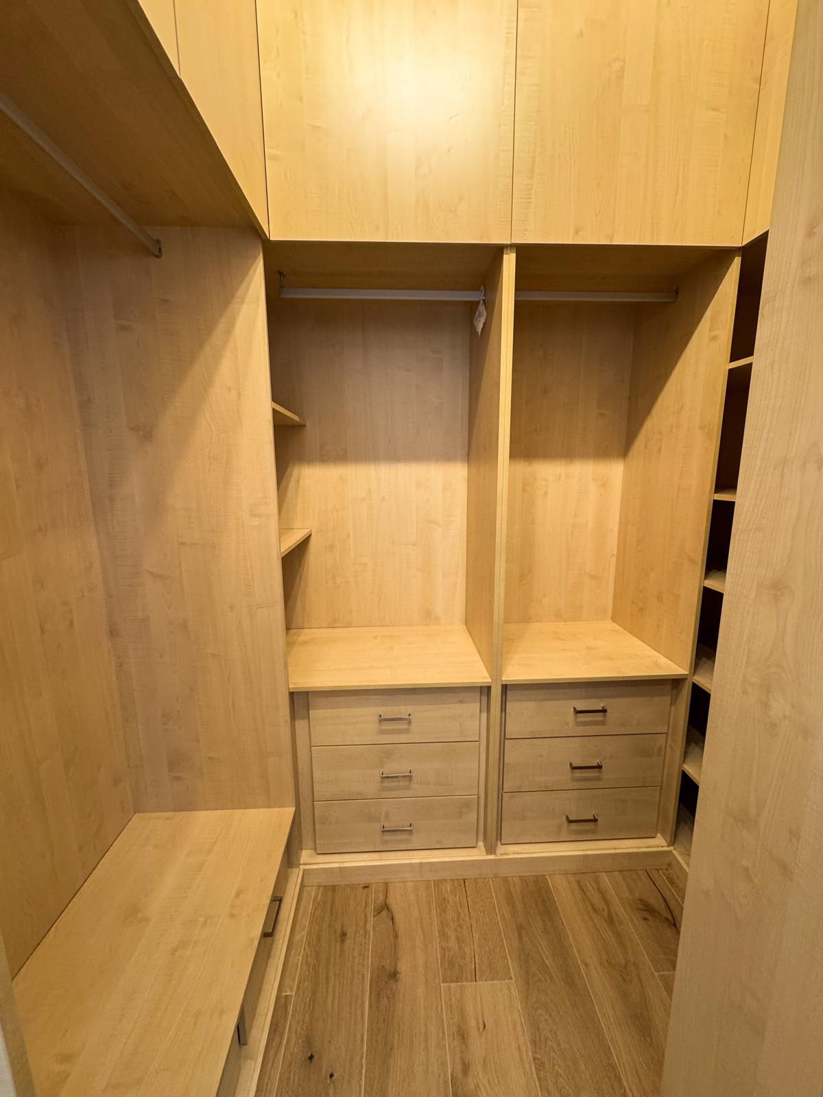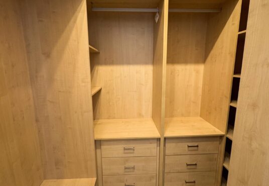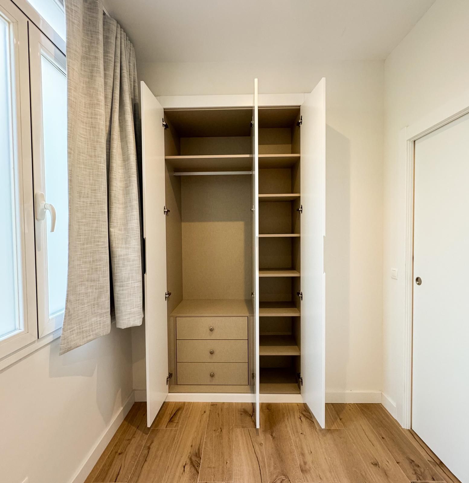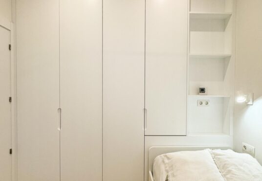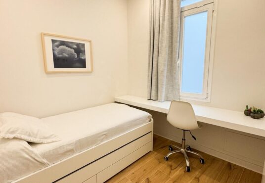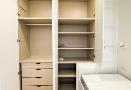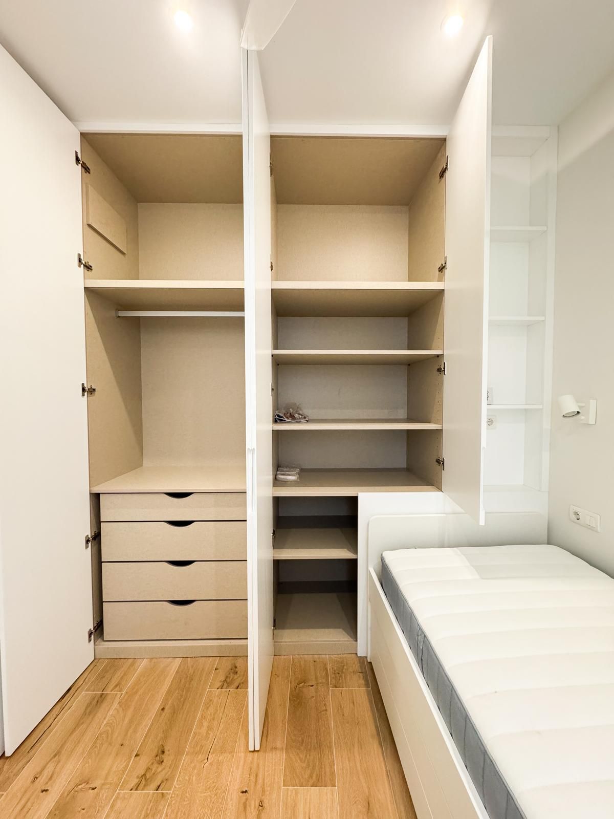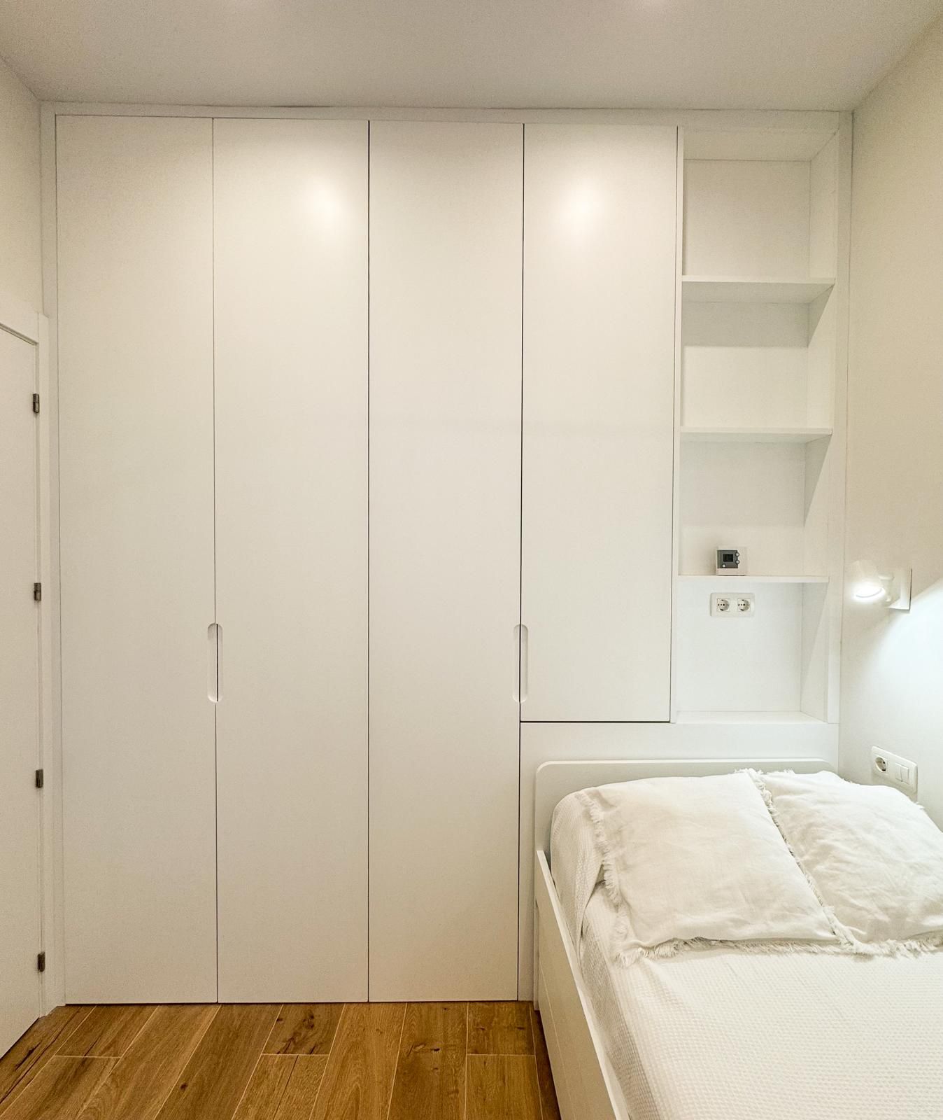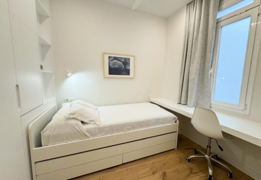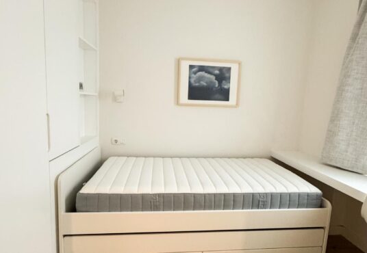Tercer dormitorio con cama de madera blanca con cama auxiliar nido, armario empotrado y escritorio a medida, ideal como habitación juvenil o despacho.