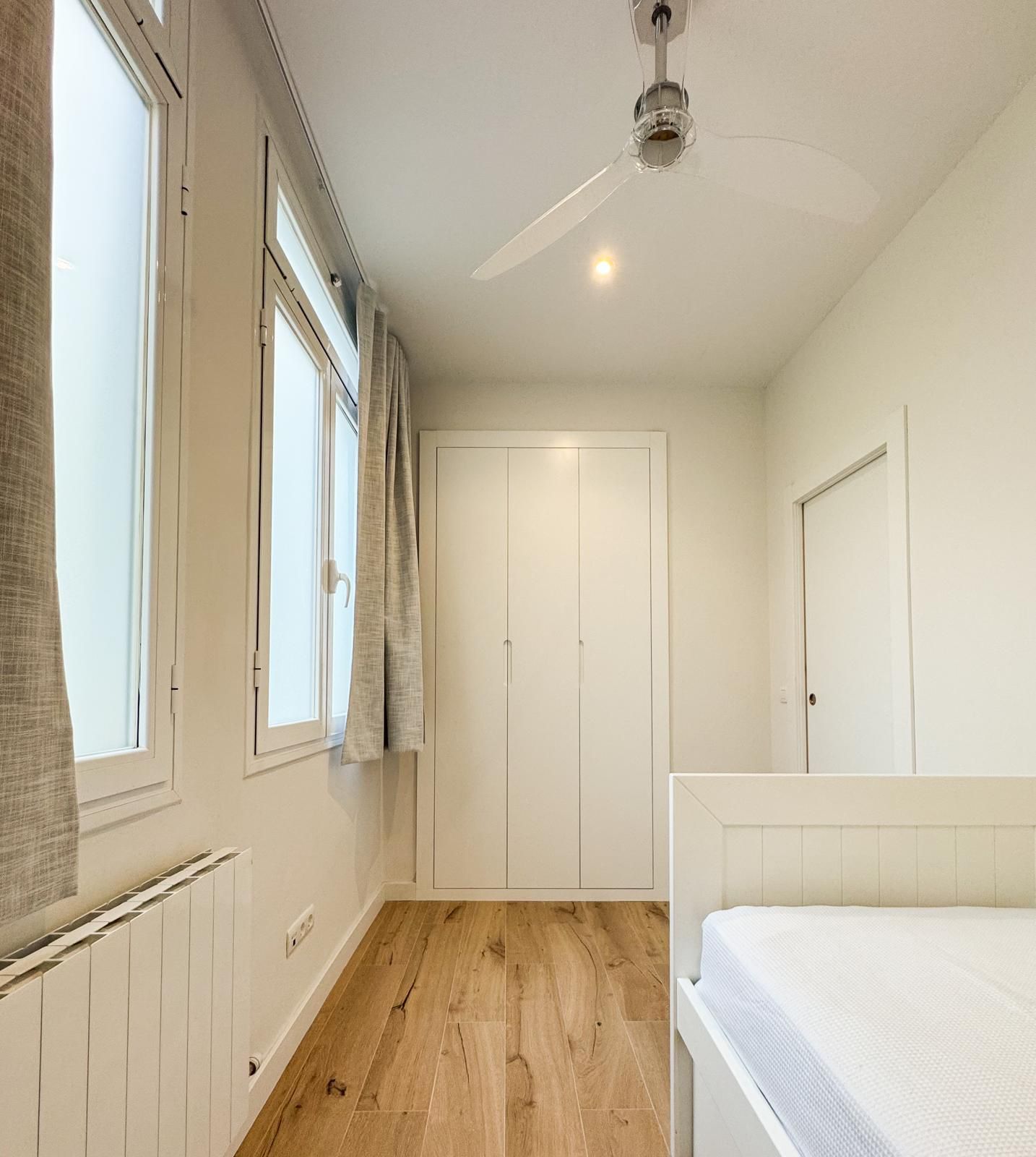 Segundo dormitorio con cama de madera blanca y cama auxiliar tipo nido, armario empotrado y ventilador de techo.