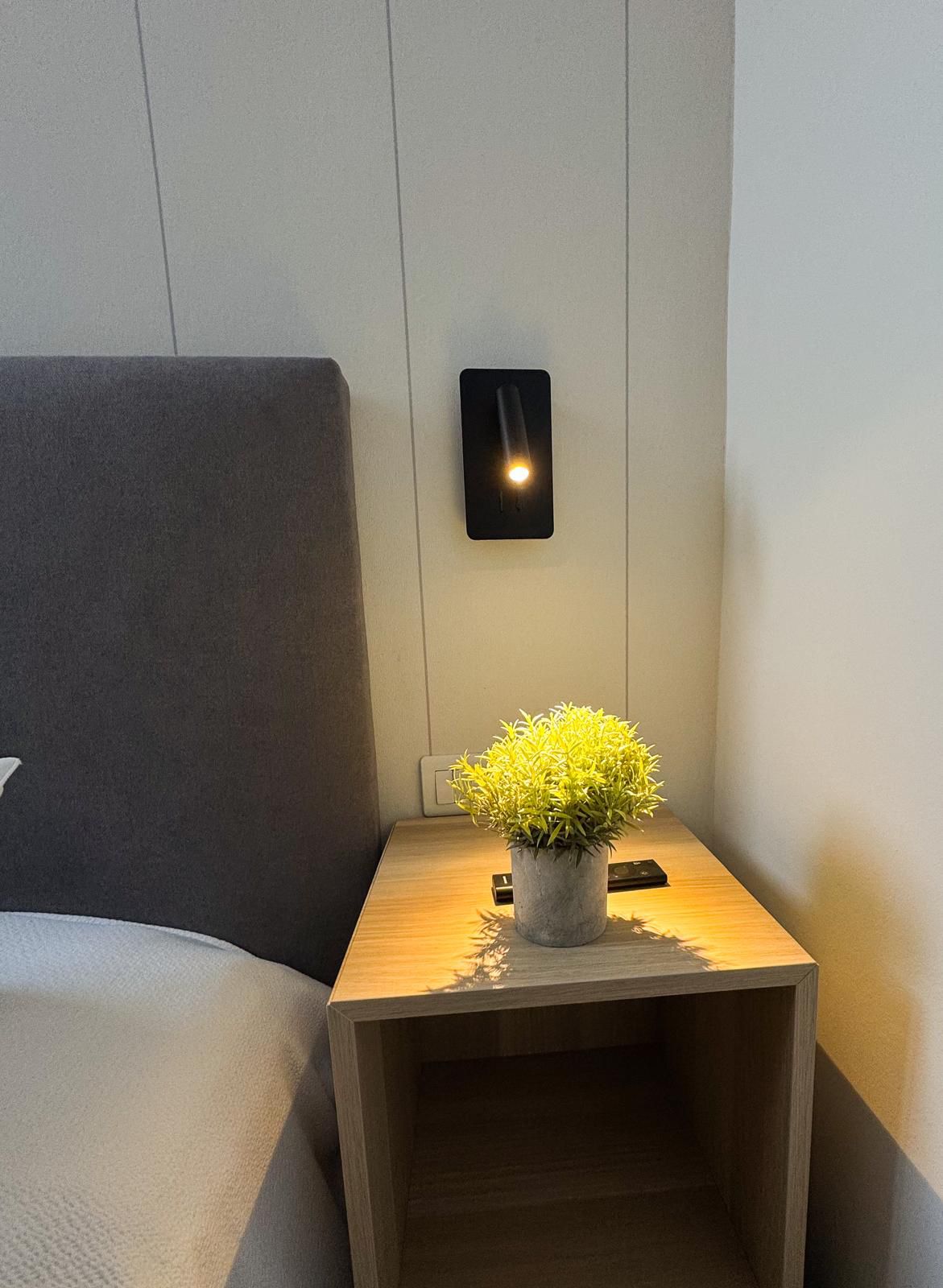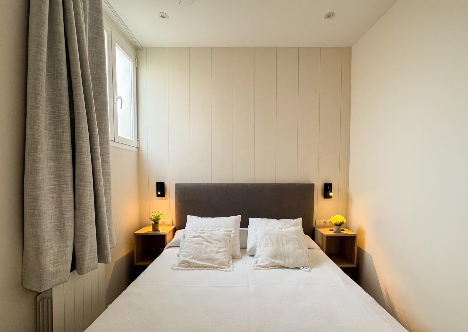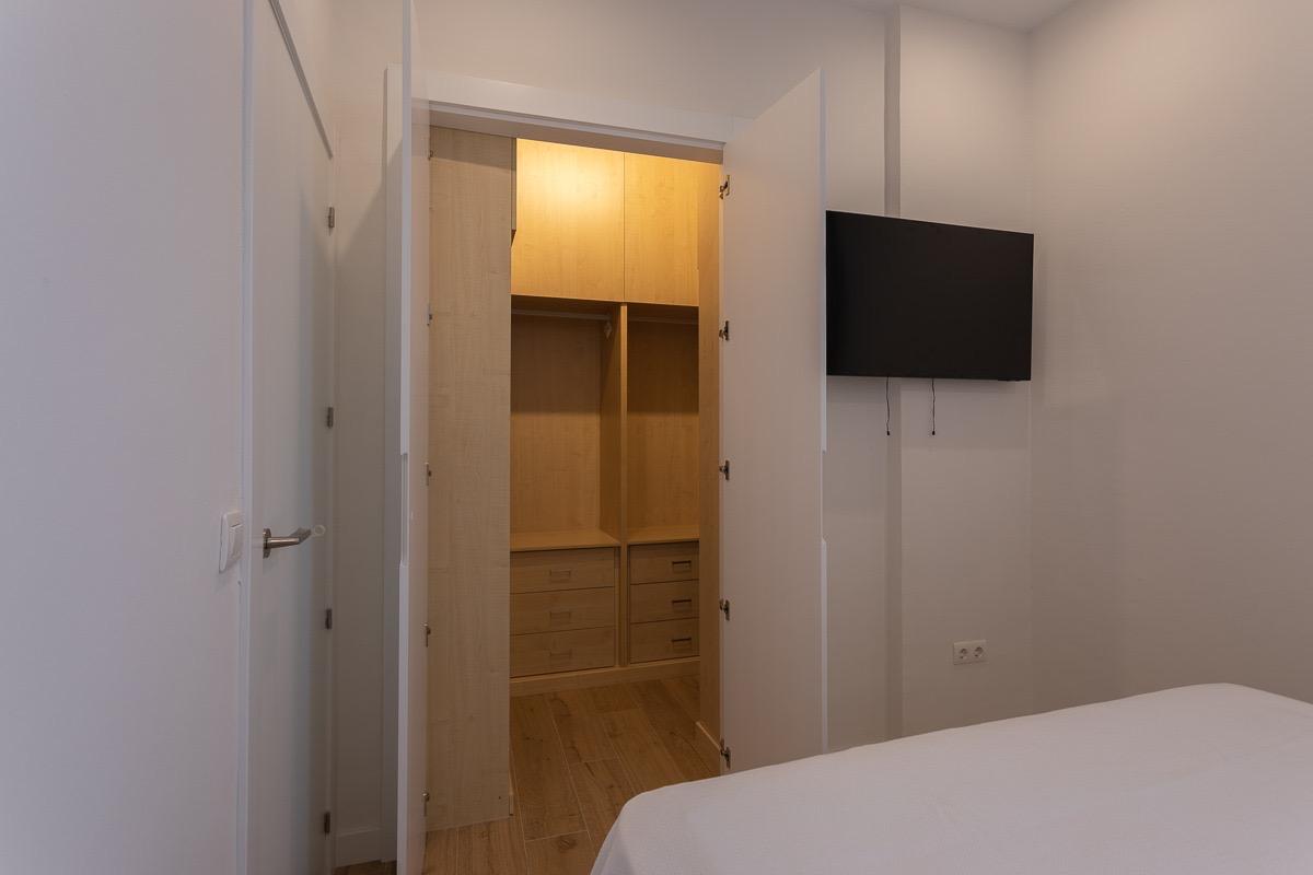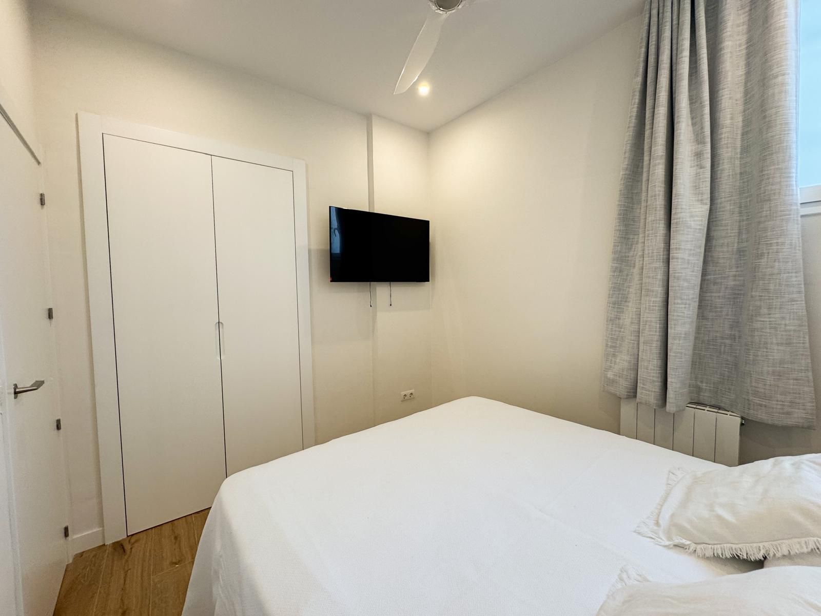 Dormitorio principal con cama canapé de 150×190, cortina ignífuga blackout, Smart TV de 43”, vestidor de madera con puertas lacadas en blanco, dos mesitas de noche y ventilador de techo con palas transparentes.