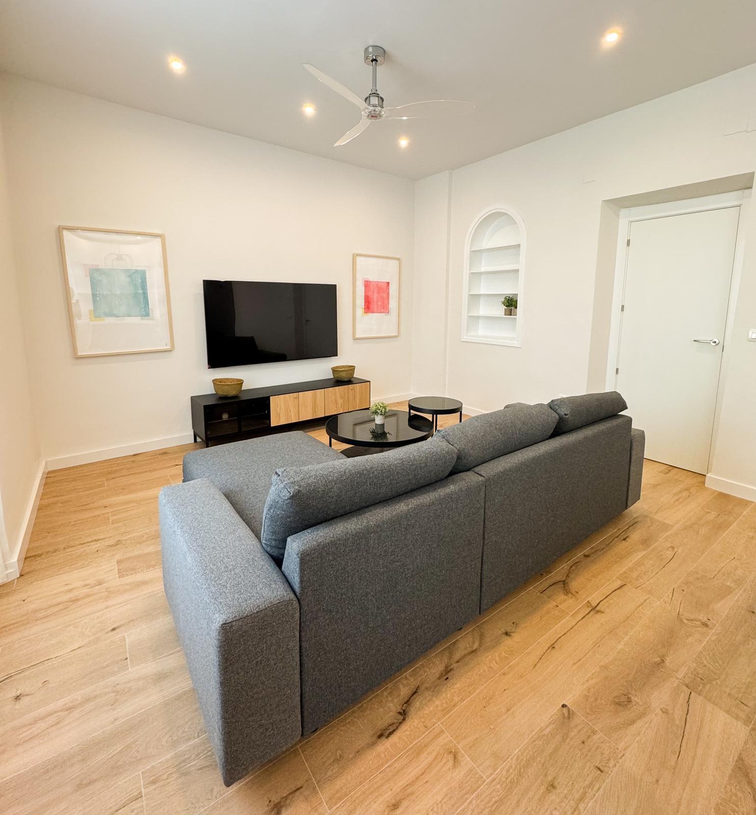 El salón está elegantemente amueblado con sofá chaise longue gris oscuro, mesas de centro de mármol negro, cortinas ignífugas, estanterías lacadas en blanco y una espectacular TV de 63”, creando un ambiente moderno y confortable.