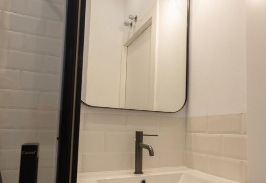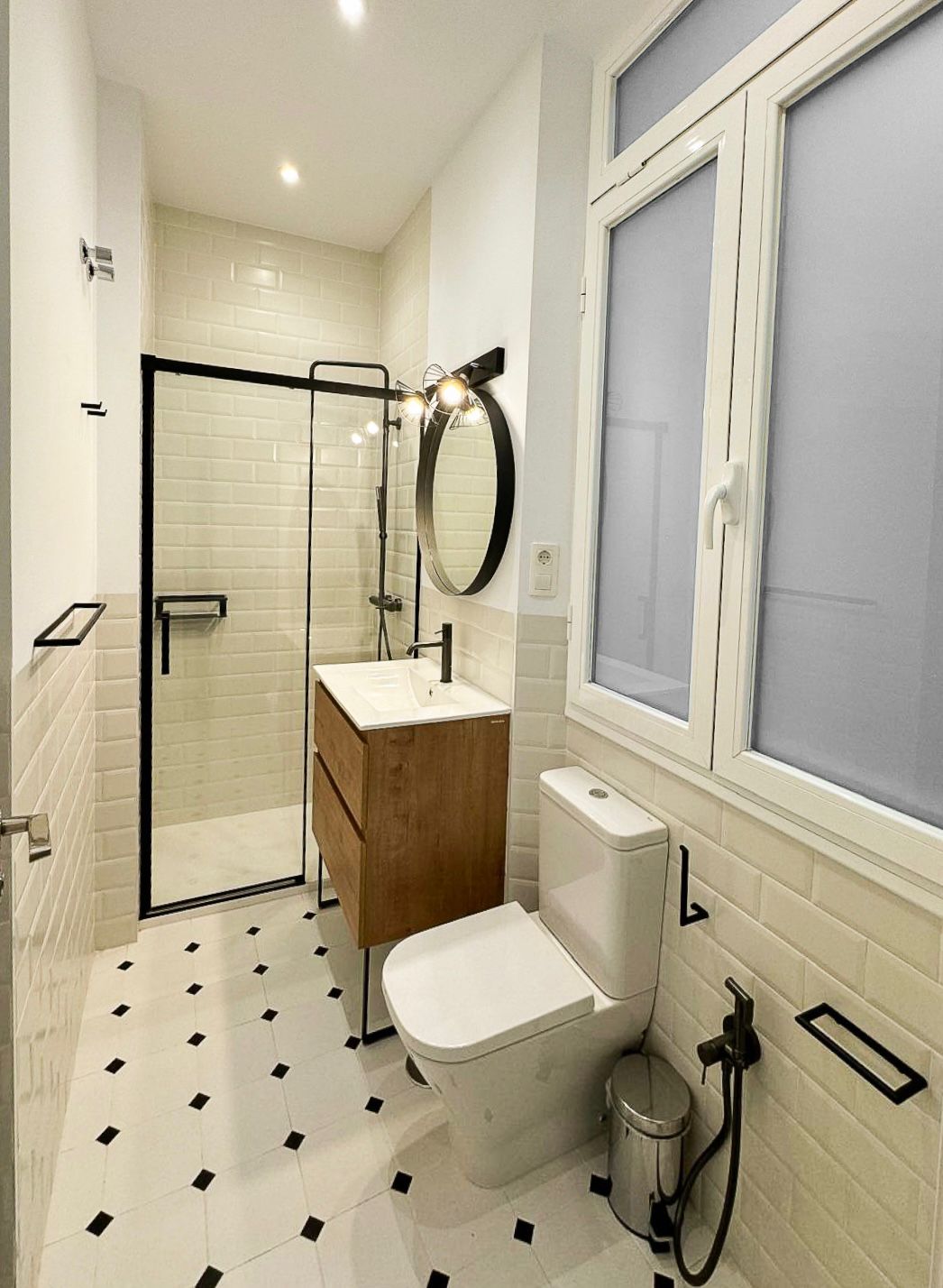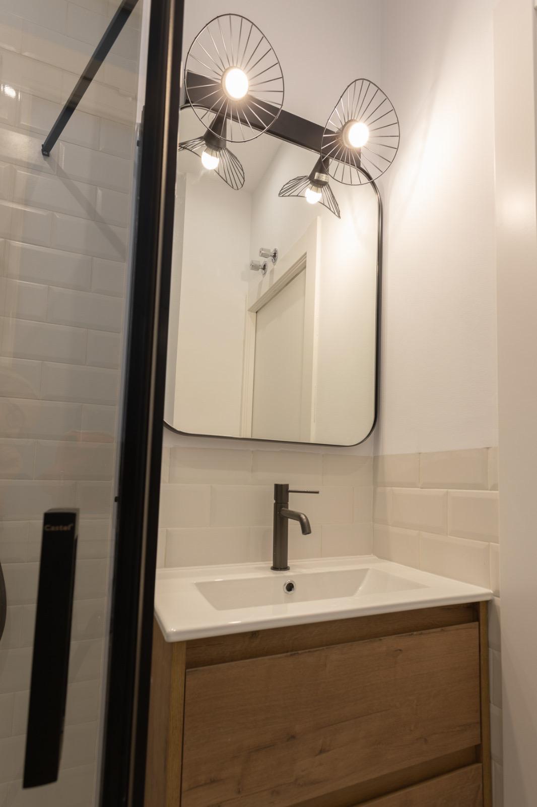 Un segundo baño con cabina de ducha, mueble de lavabo, grifería negra, espejo y focos.